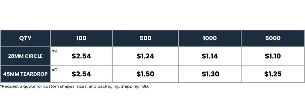 Rectangle: 40mmx30mm; Teardrop: 30mmx40mm; Circle: 30mm; Custom Shape (+Mold Fee)